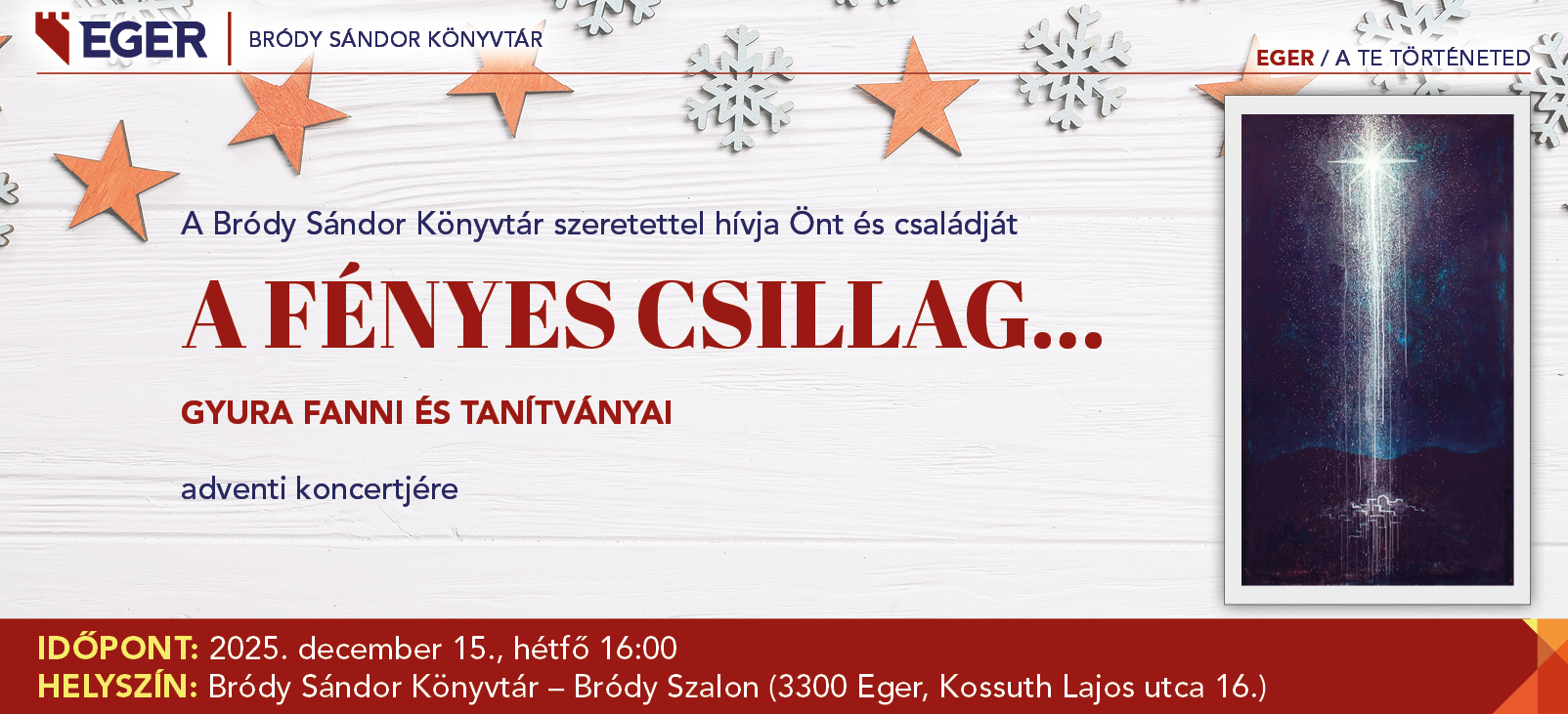 A Bródy Sándor Könyvtár szeretettel hívja Önt és családját A fényes csillag… Gyura Fanni és tanítványai adventi koncertjére.