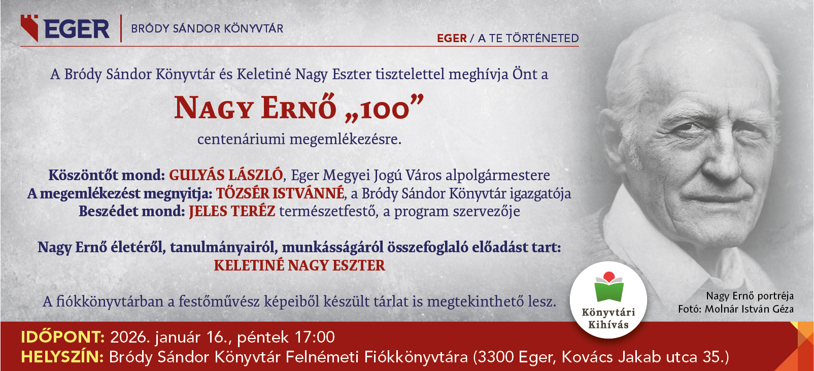 A Bródy Sándor Könyvtár és Keletiné Nagy Eszter tisztelettel meghívja Önt a Nagy Ernő „100” centenáriumi megemlékezésre.