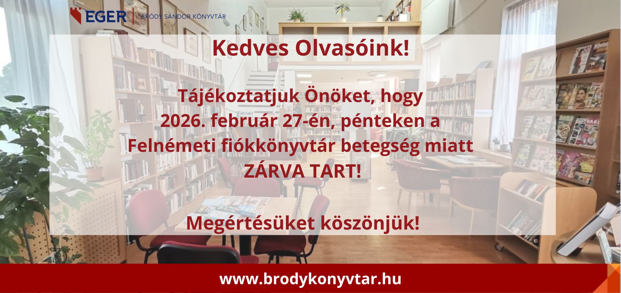 Tájékoztatjuk kedves Olvasóinkat, hogy 2026. február 27-én, péntek a Felnémeti fiókkönyvtár betegség miatt ZÁRVA TART.