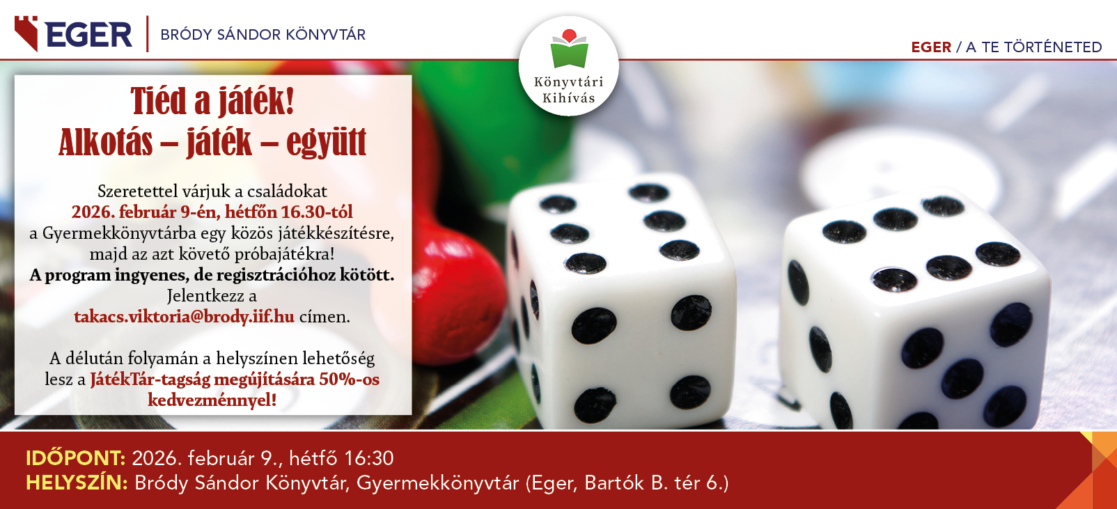 Szeretettel várjuk a családokat 2026. február 9-én, hétfőn 16.30-tól a gyermekkönyvtárba egy közös játékkészítésre, majd az azt követő próbajátékra!