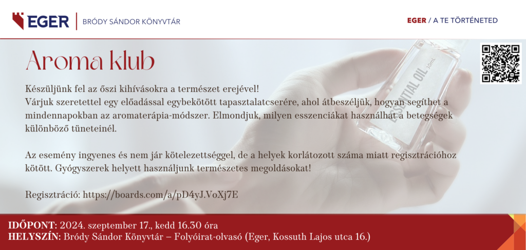 Készüljünk fel az őszi kihívásokra a természet erejével! Várjuk szeretettel egy előadással egybekötött tapasztalatcserére, ahol átbeszéljük, hogyan segíthet a mindennapokban az aromaterápia-módszer.