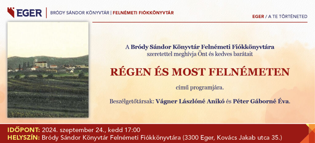 Régen és most Felnémeten A Bródy Sándor Könyvtár szeretettel meghívja Önt és kedves barátait a Régen és most Felnémeten című programjára. Beszélgetőtársak: Vágner Lászlóné Anikó és Péter Gáborné Éva Az első írásos említés Felnémetről 1261-ből való. IV. Béla oklevélben az egri püspökségnek ajándékozta. A középkorban a megye egyik legnépesebb települése. Miután a török elfoglalta Eger várát 110 […]