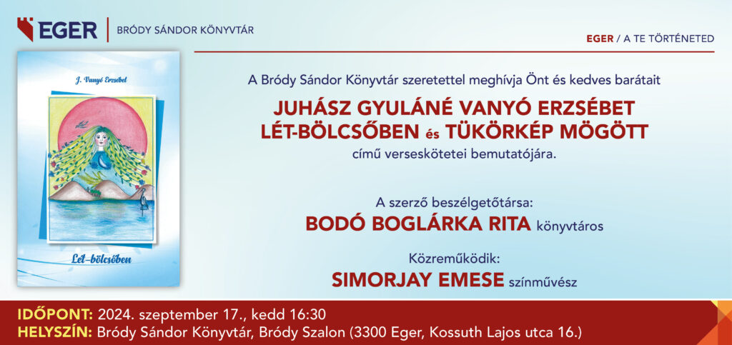 Szeretettel meghívjuk Önt és kedves barátait Juhász Gyuláné Vanyó Erzsébet Lét-bölcsőben és Tükörkép mögött című versesköteteinek bemutatójára.