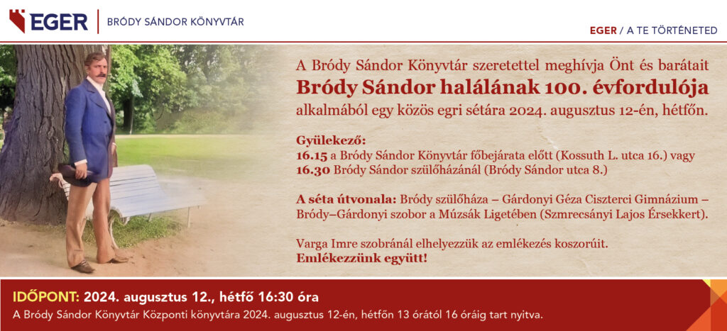 Bródy100 – séta A Bródy Sándor Könyvtár szeretettel meghívja Önt és barátait Bródy Sándor halálának 100. évfordulója alkalmából egy közös egri sétára. Időpont: 2024. augusztus 12., hétfő, 16:30 óra Gyülekező: 16.15: a Bródy Sándor Könyvtár főbejárata előtt (Kossuth L. utca 16.), vagy 16.30: Bródy Sándor szülőházánál (Bródy Sándor utca 8.) A séta útvonala: Bródy […]