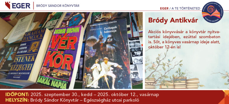 Újra Bródy Antikvár! Akciós könyvvásár a könyvtár nyitvatartási idejében 2025. szeptember 30., kedd – október 12., vasárnap.