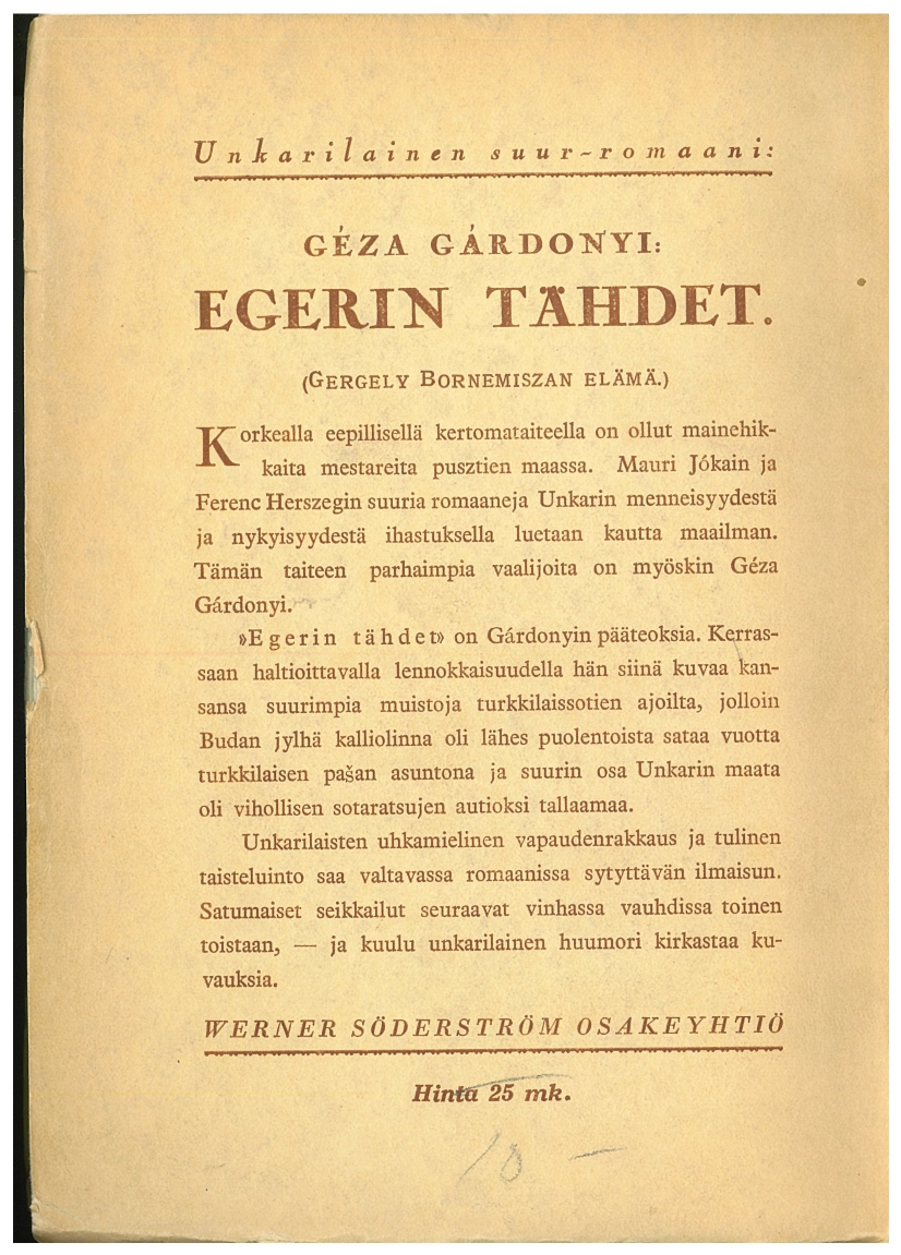 Yrjö Liipola (1881-1971) szabadidejében magyar irodalmi műveket fordított finnre. Az első „Móricz Zsigmond: Légy jó mindhalálig” története volt, amit az „Egri csillagok” követett. Így a mű 1899-es megszületése után 27 évvel, 1926-ban jelent meg az első (lásd: az 1. rész borítója), majd egy évvel később a második könyv a Werner Söderström Osakeyhtiö (WSOY) kiadónál, ami a finnek egyik legpatinásabb könyvkiadója. 1878 óta foglalkozik a finn és a külföldi irodalom népszerűsítésével. Egyébként stílusában a finn kiadás borítója hasonlít az 1925-ös magyar verzióra.