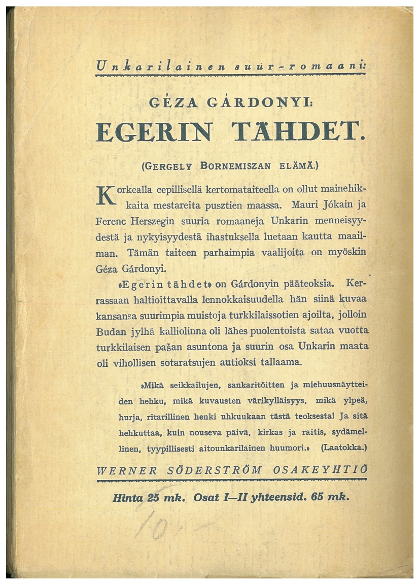 Tudtad, hogy az Egri csillagok első idegen nyelvű kiadása csak az író halála után, 1926-27-ben (I. és II. rész külön) jelent meg, méghozzá Finnországban, „Egerin tähdet” címmel?