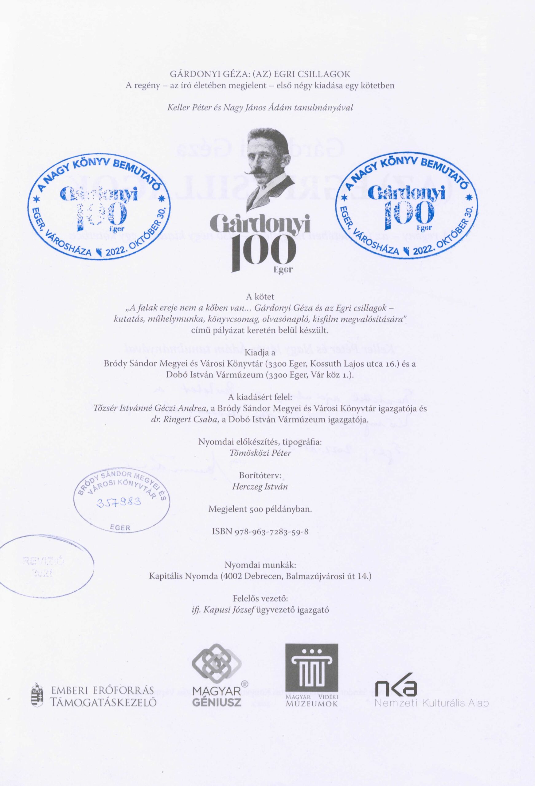 Tudtad, hogy 2022.10.30-án, az író halálnak 100. évfordulóján, a „Gárdonyi 100” programsorozathoz kapcsolódva a Dobó István Vármúzeum és a Bródy Sándor Könyvtár sikeres közös pályázatának köszönhetően egy különleges, négy az egyben „(Az) Egri csillagok” kiadványt vehettek kézbe az érdeklődők?