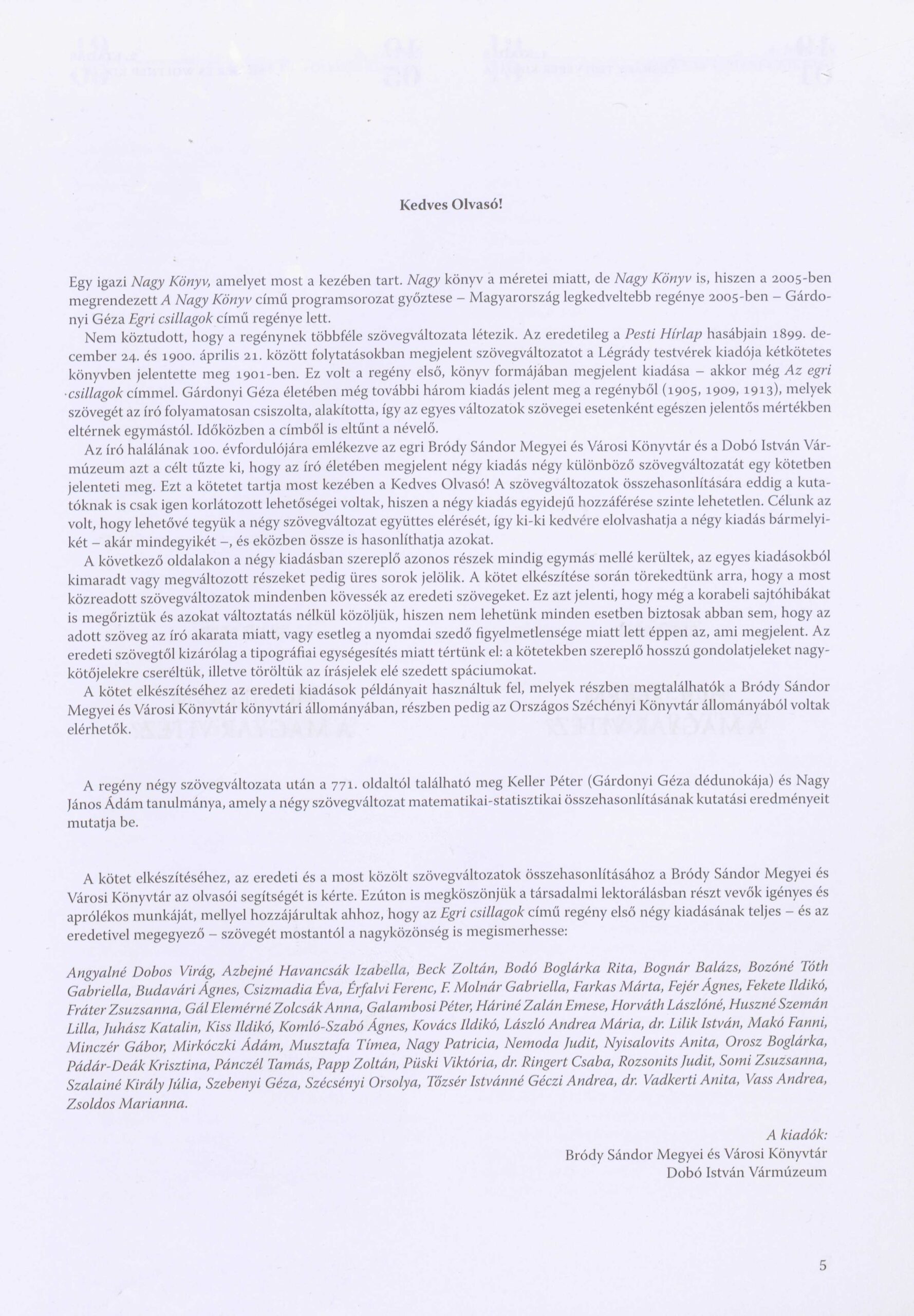 Több éves előkészület után jelent meg ez a hiánypótló mű. A munkát két Gárdonyi-kutató, Nagy Ádám János és Keller Péter, Gárdonyi dédunokája kezdte el több évvel ezelőtt, amit az NKA Magyar Géniusz Program Ideiglenes Kollégiuma pályázatnak köszönhetően a Vármúzeummal és a Bródy Könyvtárral közösen valósítottak meg. Felteheti bárki a kérdést: “Mi ebben az Egri csillagokban olyan különleges? Tudunk még valami újat mutatni?” A válasz: “Igen!” A 784 oldalas, limitált kiadású Nagy „Nagy Könyv” egyszerre tartalmazza a regény 1901-es első, valamint az 1905-ös, 1909-es és 1913-as, vagyis az író életében megjelent változatokat, illetve Nagy Ádám János és Keller Péter “Az Egri csillagok szövegváltozatai” című tanulmányát. A különleges tördelésnek (Tömösközi Péter) köszönhetően vizuálisan is nyomon követhető, hogy Gárdonyi 15 év (1898-1913) alatt mely részeknél és hogyan javította a korábbi szövegeket. Ezzel lehetővé válik az egyes szövegváltozatok további elemzése, ami akár egy későbbi szövegkritikai kiadás alapjául is szolgálhat. A mellékelt képen jól látható, hogy hogyan néz ki egy oldalpár.