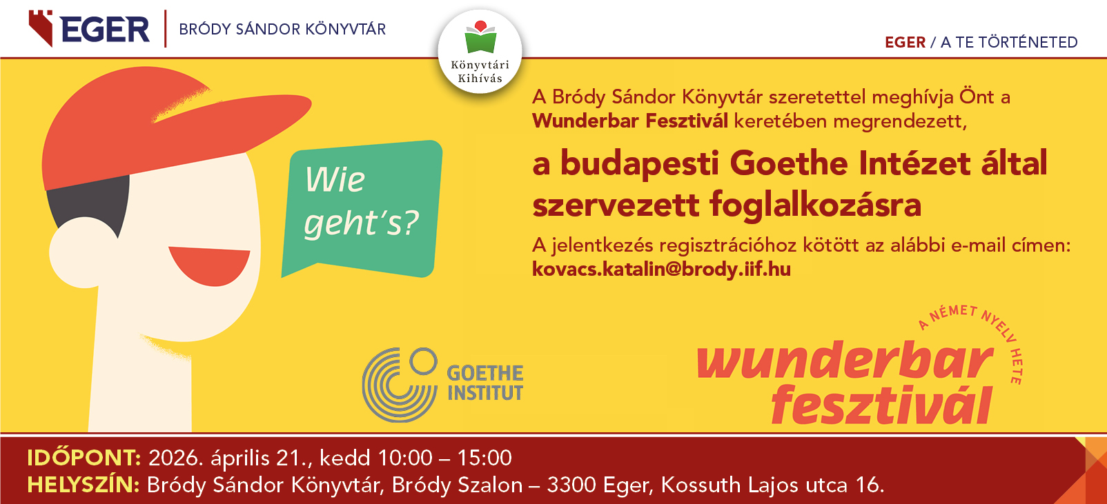 A Bródy Sándor Könyvtár szeretettel meghívja Önt a Wunderbar Fesztivál keretében megrendezett, a budapesti Goethe Intézet által szervezett foglalkozásra.