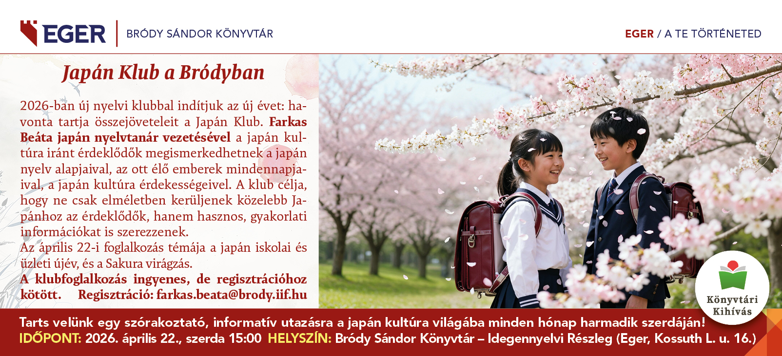 Helyszín: Bródy Sándor Könyvtár, Központi könyvtár – Eger, Kossuth Lajos utca 16.