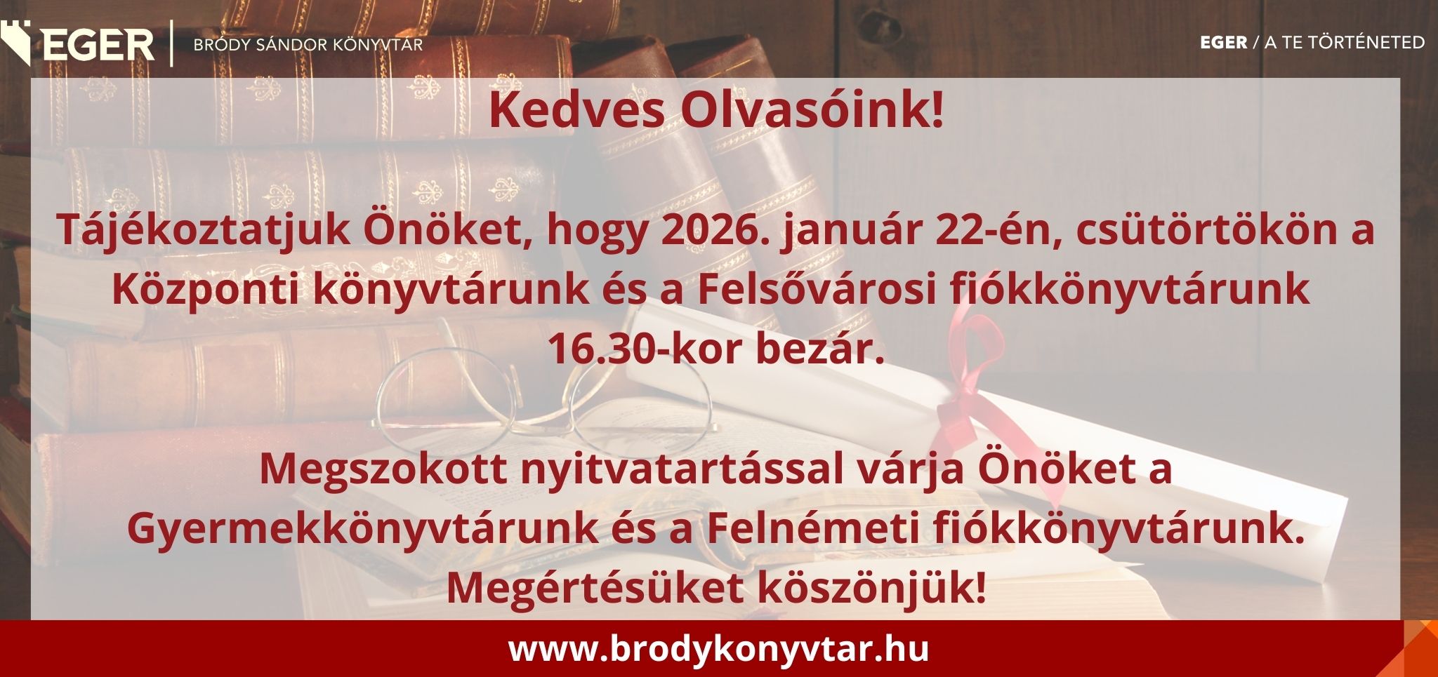 A Magyar Kultúra Napján, 2026. január 22-én, csütörtökön a Bródy Sándor Könyvtár részlegei az alábbiak szerint tartanak nyitva