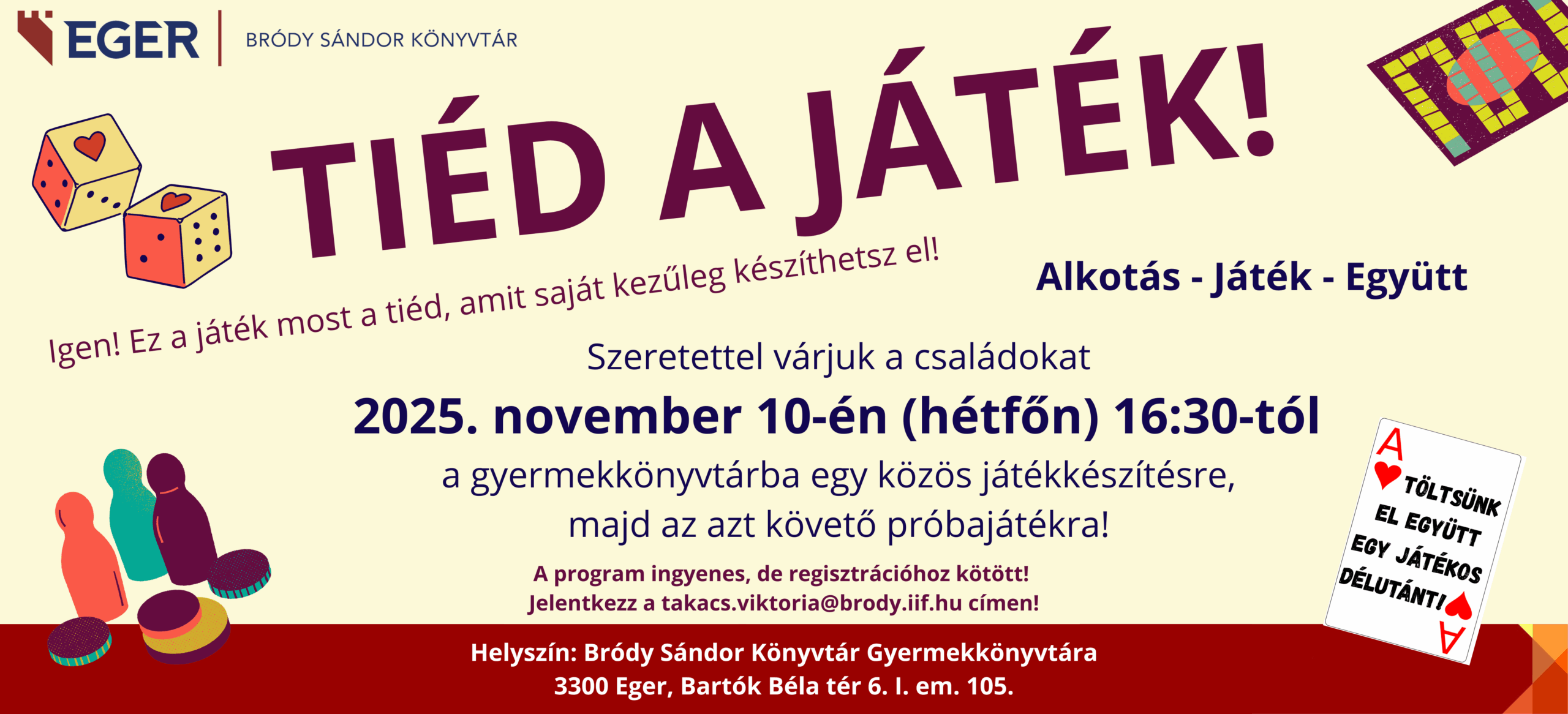 A Bródy Sándor Könyvtár Gyermekkönyvtára szeretettel várja a családokat 2025. november 10-én egy közös játékkészítésre.