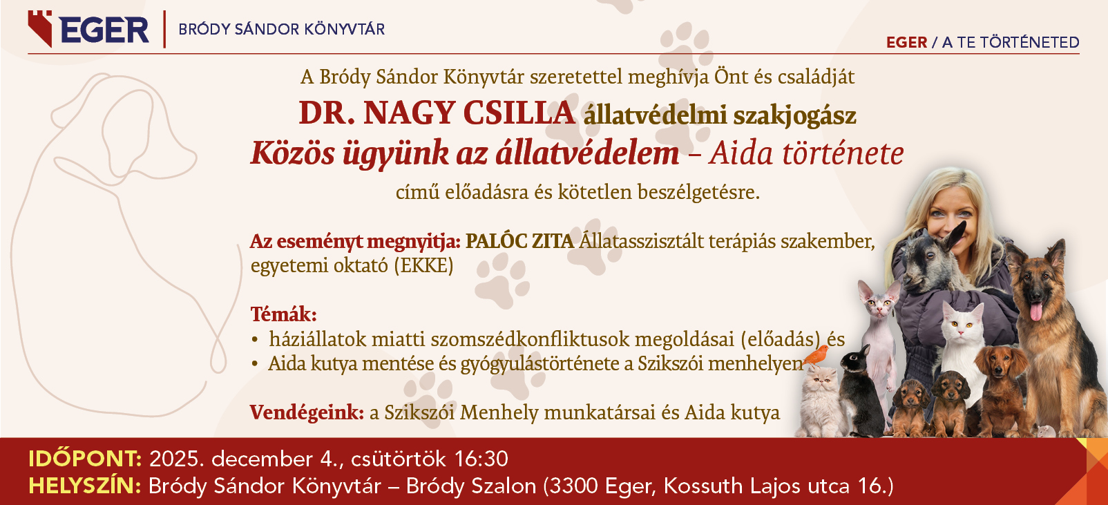 A Bródy Sándor Könyvtár szeretettel meghívja Önt és családját Dr. Nagy Csilla állatvédelmi szakjogász Közös ügyünk az állatvédelem – Aida története című