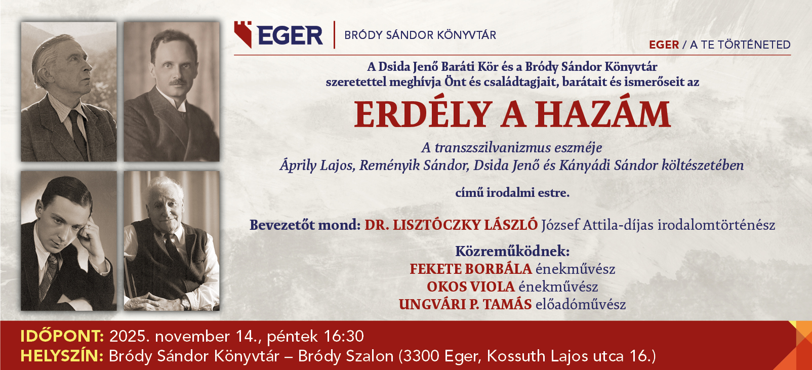 A Dsida Jenő Baráti Kör és a Bródy Sándor Könyvtár szeretettel meghívja Önt Erdély a hazám című irodalmi estre.