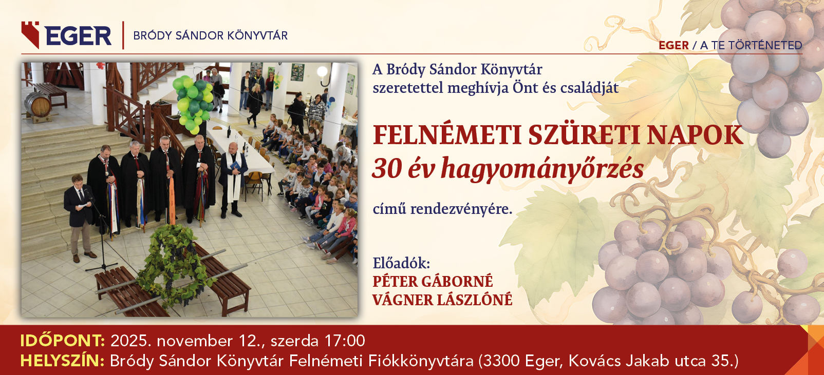 A Bródy Sándor Könyvtár szeretettel meghívja Önt és családját Felnémeti Szüreti Napok – 30 év hagyományőrzés című rendezvényre.