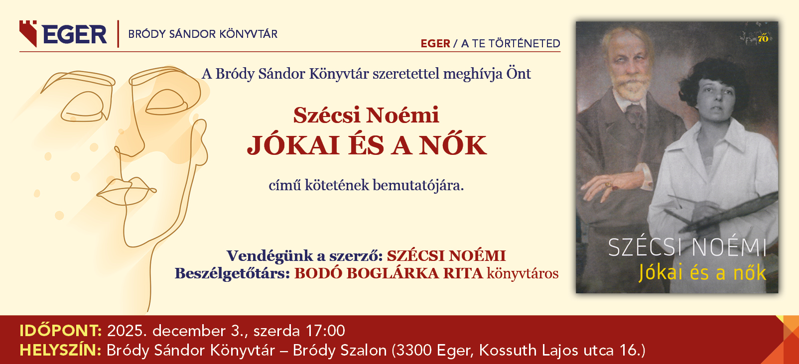 A Bródy Sándor Könyvtár szeretettel meghívja Önt Szécsi Noémi: Jókai és a nők című kötet bemutatójára.