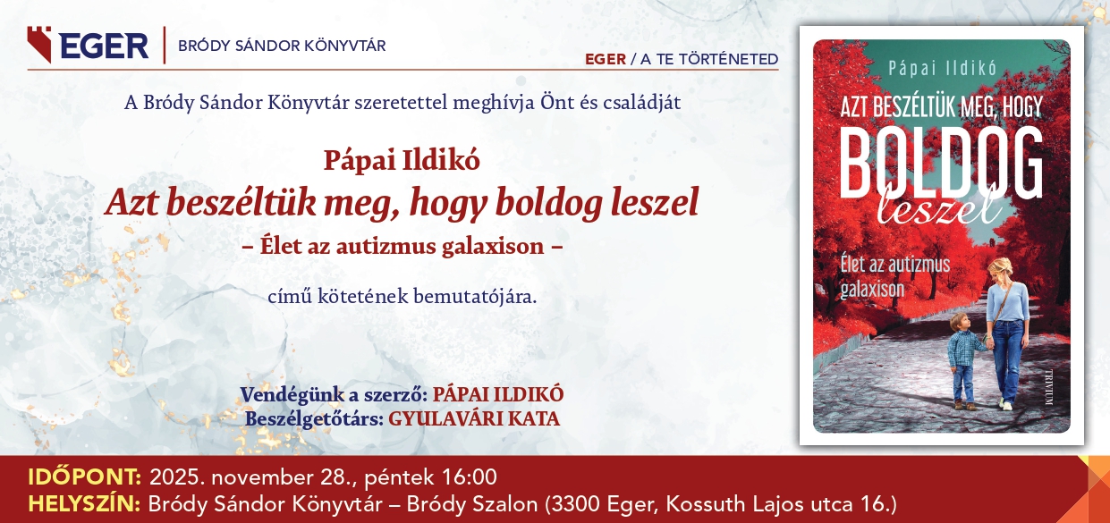 A Bródy Sándor Könyvtár szeretettel meghívja Önt Pápai Ildikó Azt beszéltük meg, hogy boldog leszel – Élet az autizmus galaxison című kötet