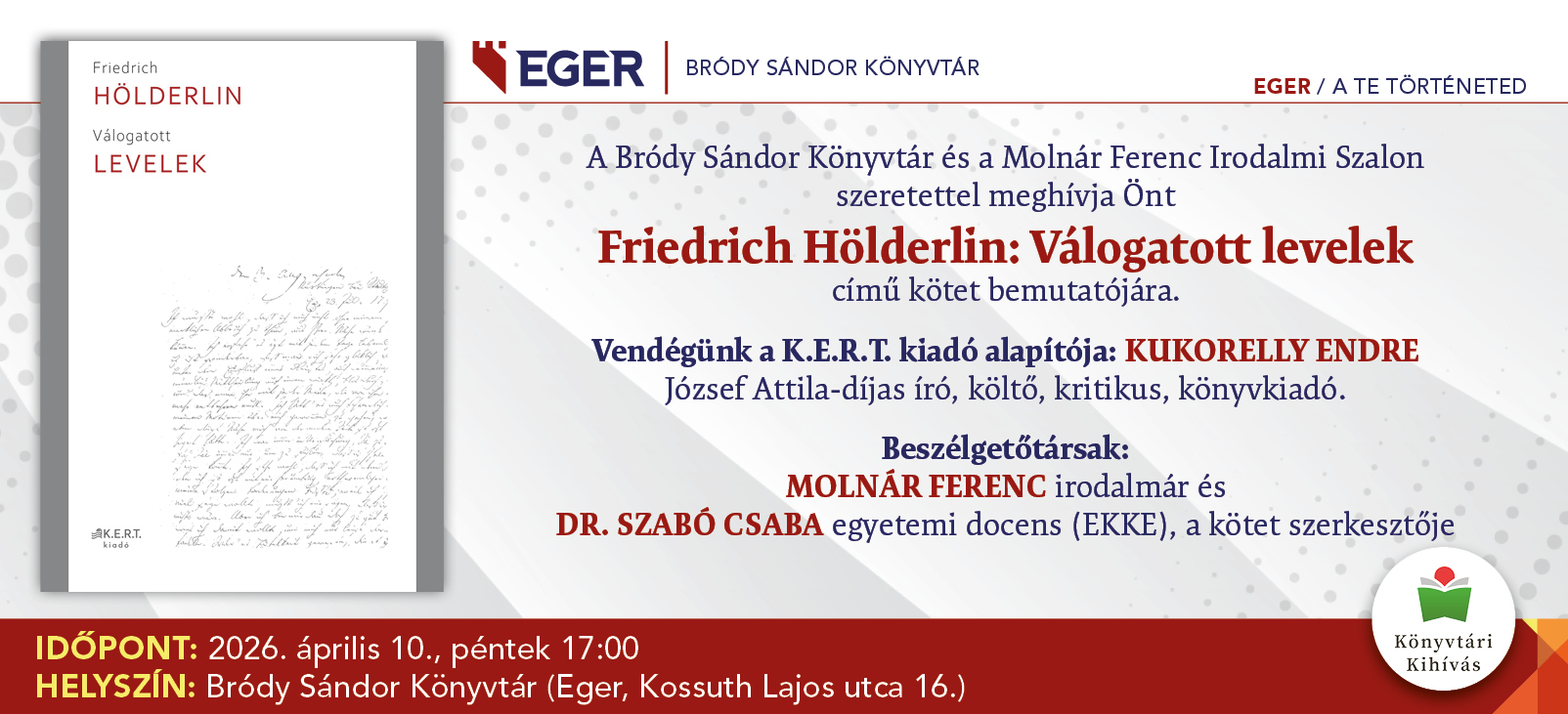 A Bródy Sándor Könyvtár és a Molnár Ferenc Irodalmi Szalon szeretettel meghívja Önt Friedrich Hölderlin: Válogatott levelek