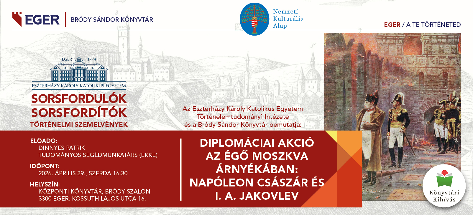 Az Eszterházy Károly Katolikus Egyetem Történelemtudományi Intézete és a Bródy Sándor Könyvtár szeretettel várja az érdeklődőket a Sorsfordulók soron következő előadására.