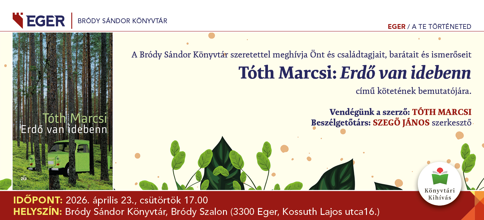 A Bródy Sándor Könyvtár szeretettel meghívja Önt Tóth Marcsi: Erdő van idebenn című kötetének bemutatójára.