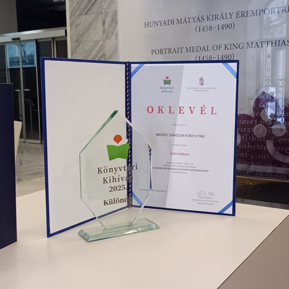 Az eseményen részt vett Gál Judit Eger MJV alpolgármestere, a díjat Hankó Balázs kultúráért és innovációért felelős minisztertől  és Vincze Máté helyettes államtitkártól vette át könyvtárunk vezetősége az Országos Széchényi Könyvtárban 2025. november 3-án délelőtt.